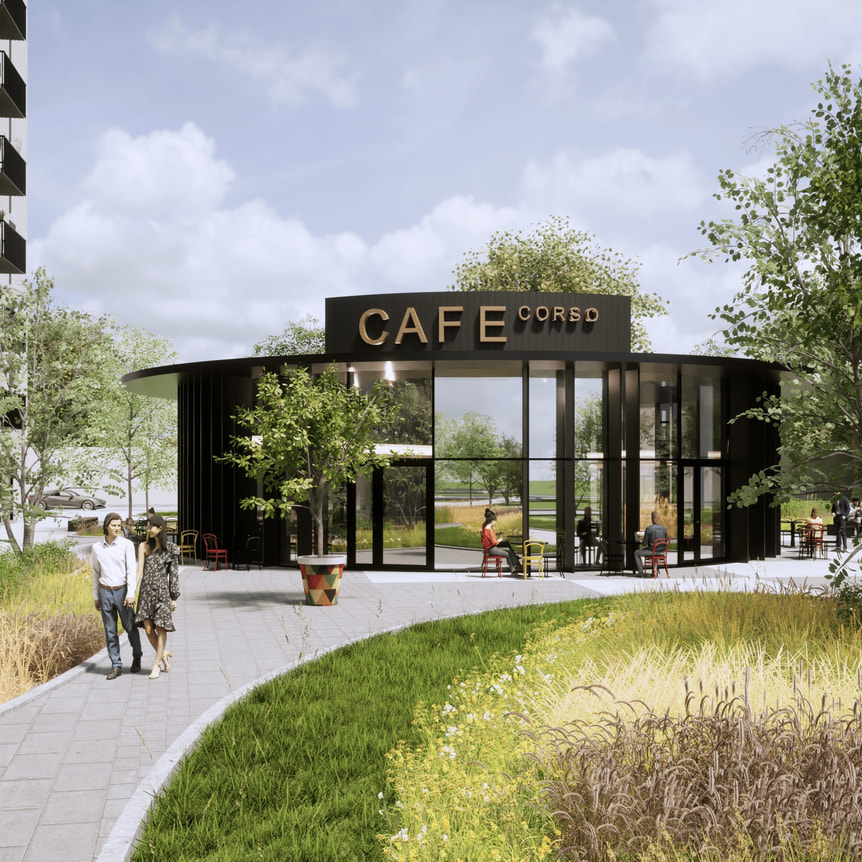 Najbardziej charakterystycznym punktem projektu i wizytówką Inwestycji, będzie „Corso” – reprezentacyjny deptak biegnący wzdłuż całego osiedla, zakończony zielonym skwerem miejskim z kawiarnią w kształcie okręgu.